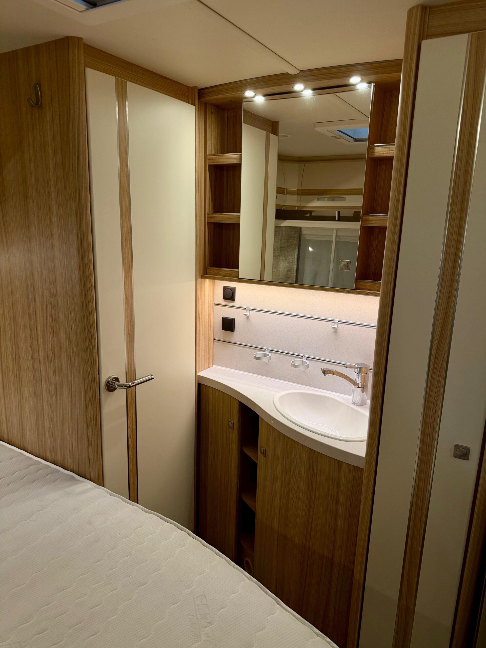 • Wastafel in wit met opbergvakken en verlichte spiegel (naast bed)