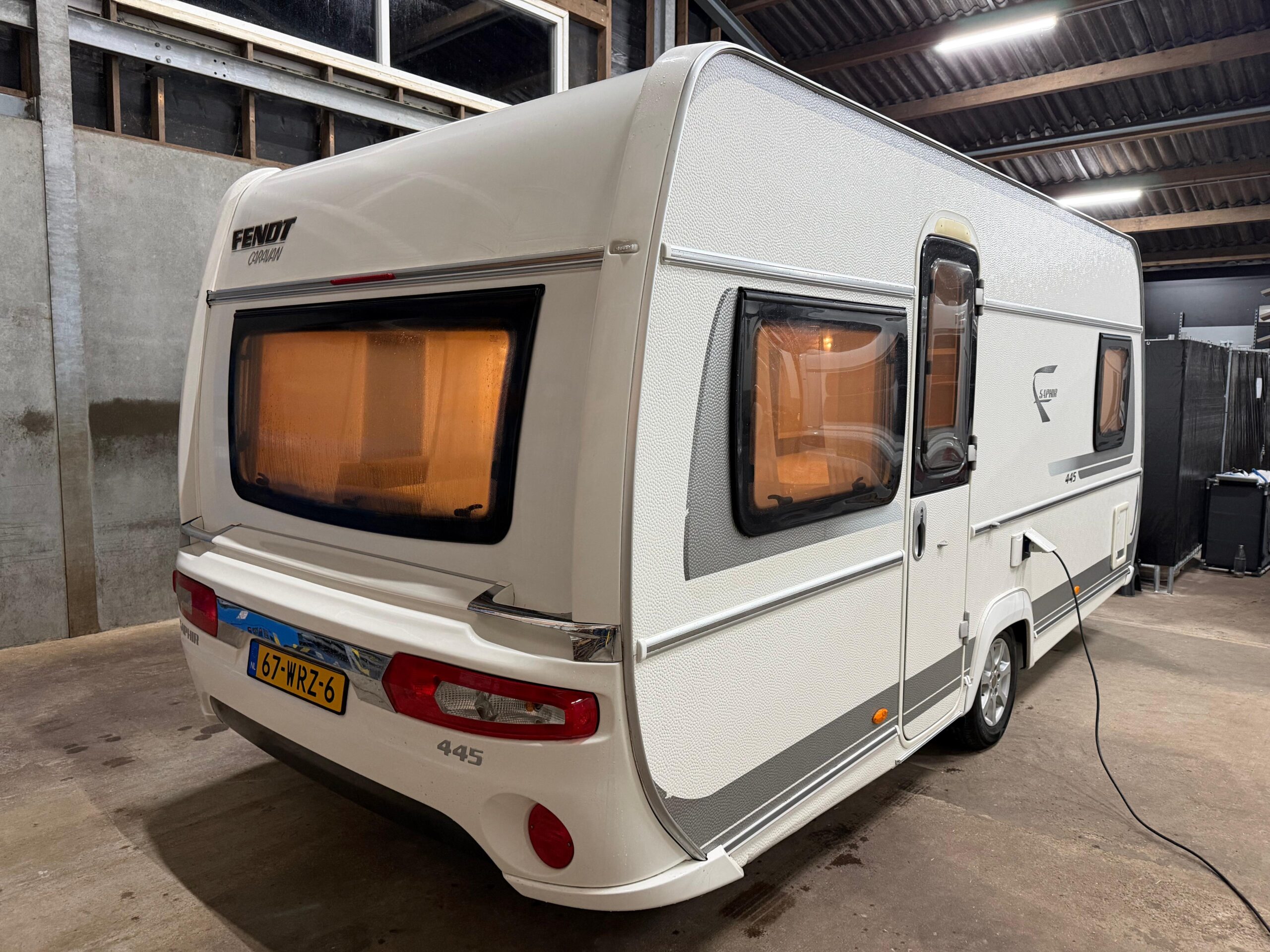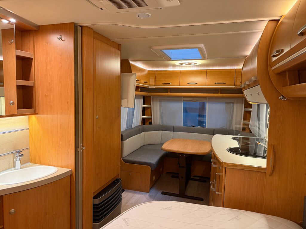 Caravan staat in een helder verlichte ruimte. Bezichtiging in de avond is daardoor geen enkel probleem.