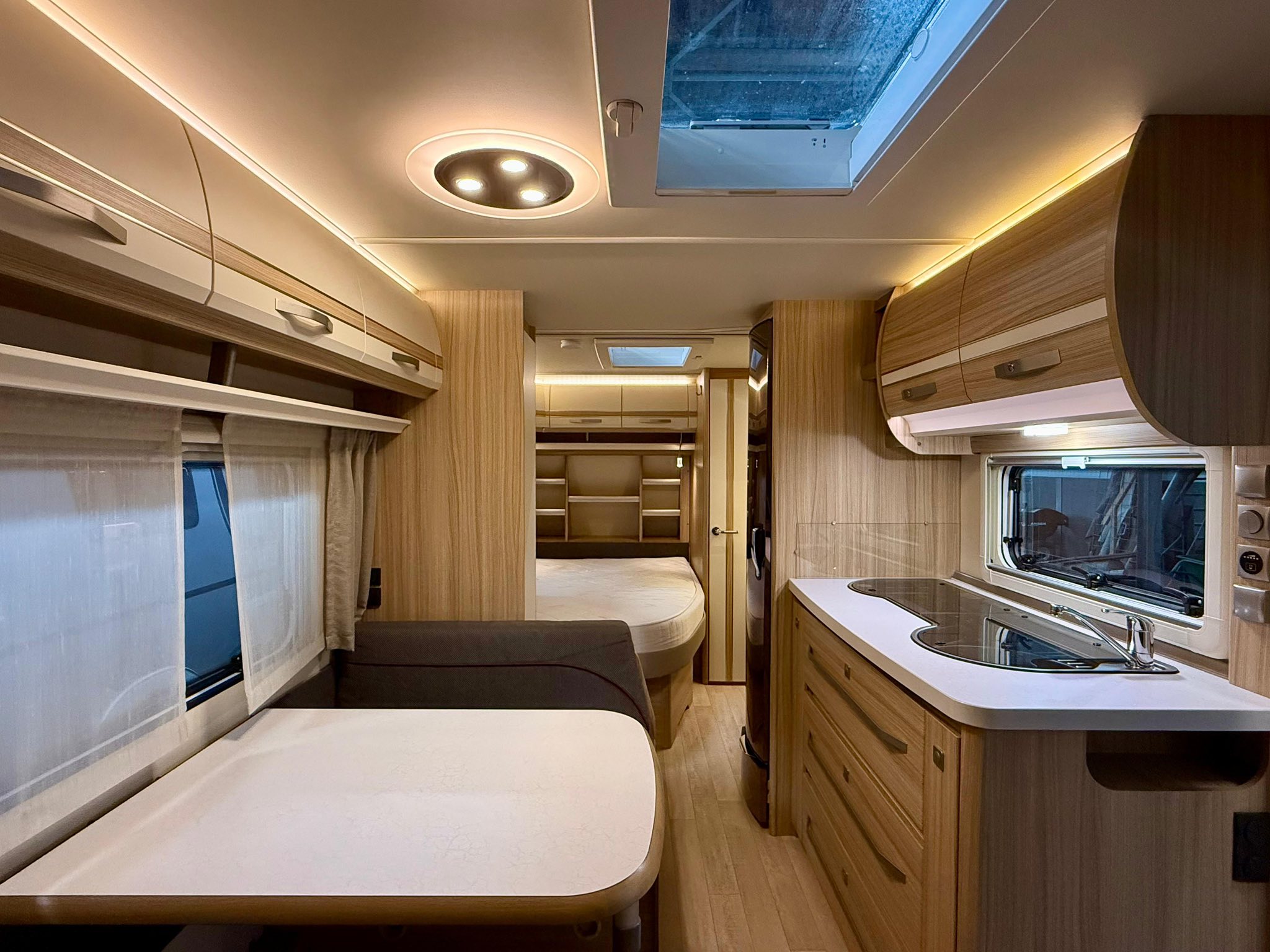 Caravan staat in een helder verlichte ruimte. Bezichtiging in de avond is daardoor geen enkel probleem.