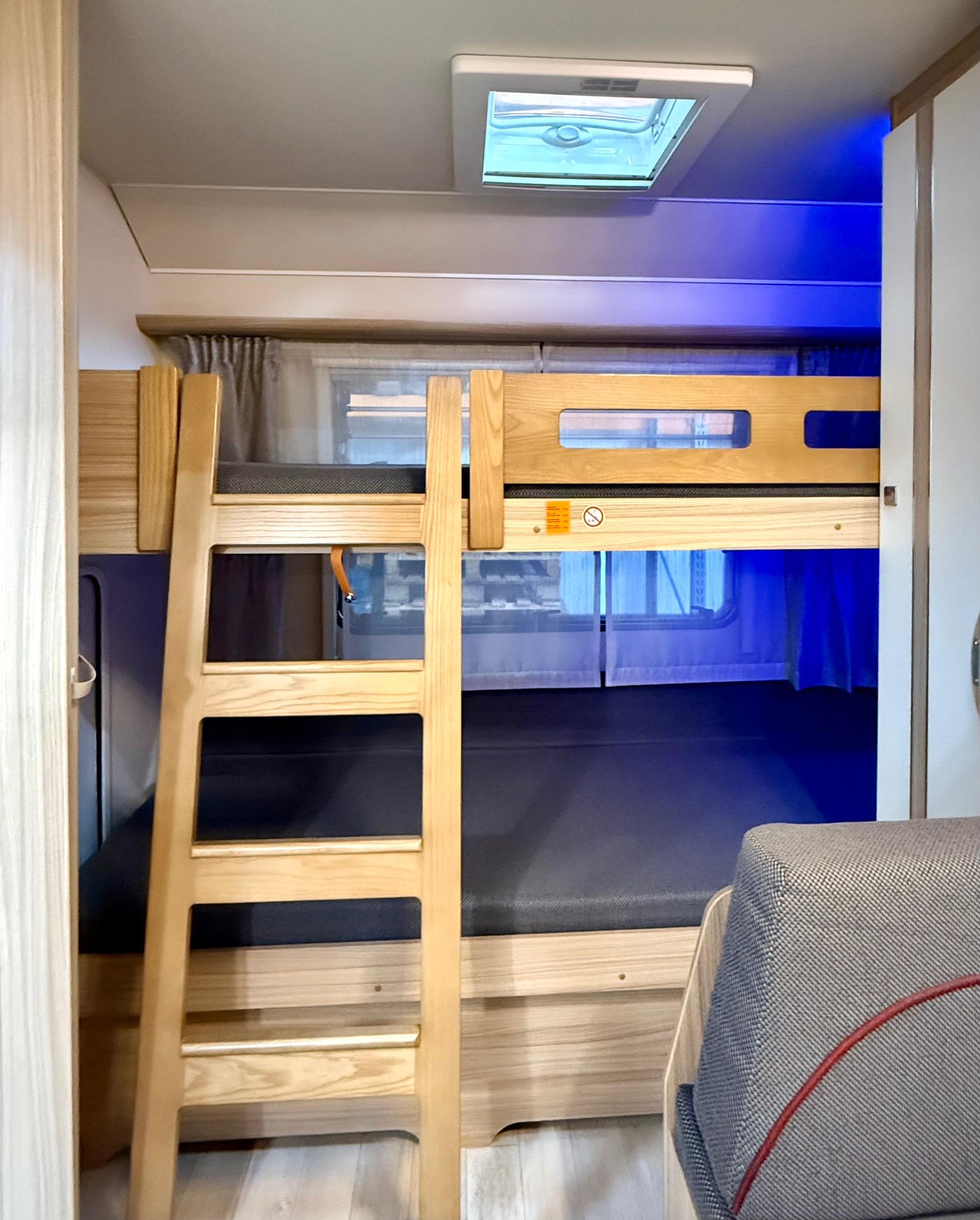 • 2 Stapelbedden (80 x 210) en (75 x 216) met lattenbodems, onderste bed op te klappen voor extra berg/speelruimte